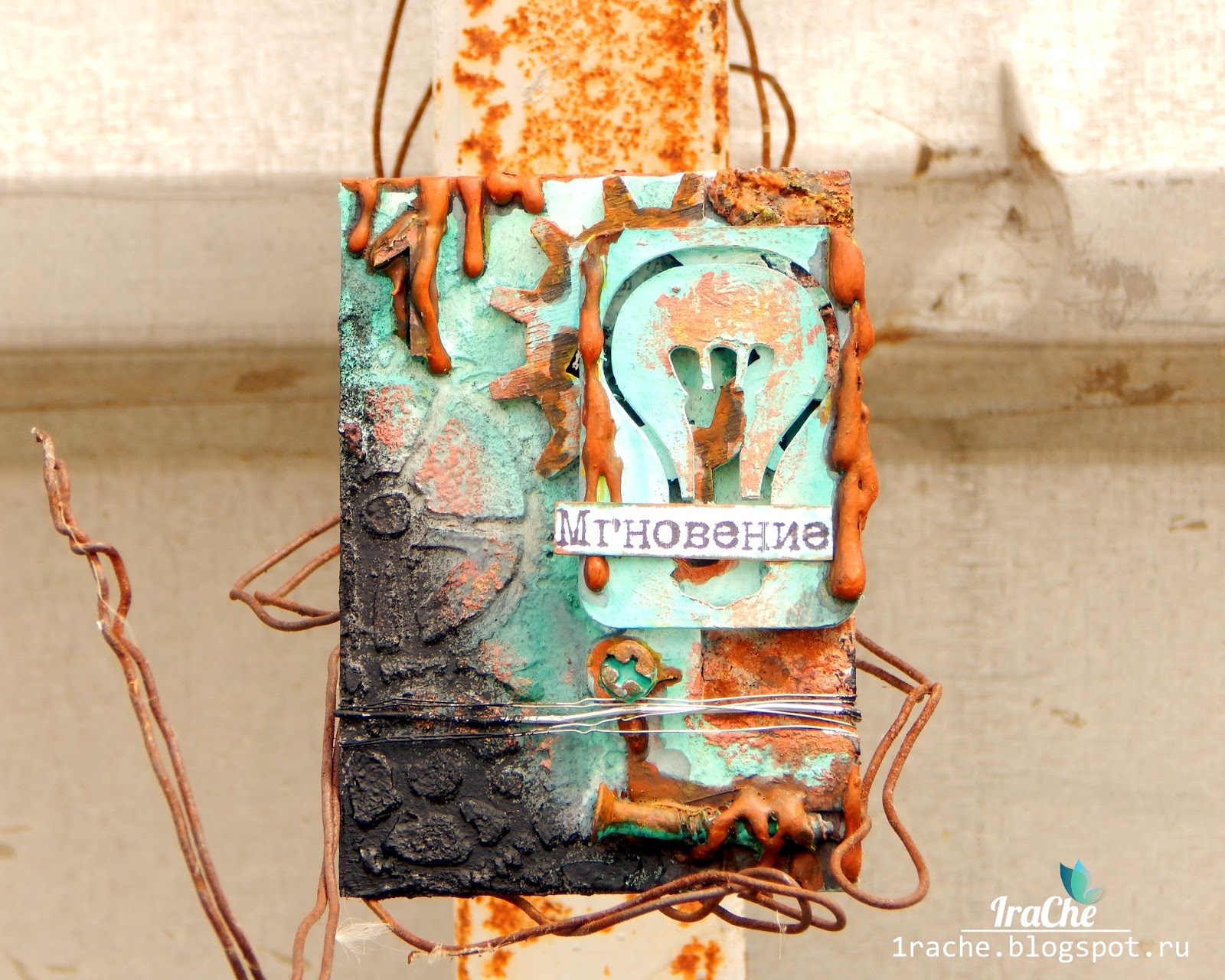 Каждая карточка имеет номер: 1, 2, 3 и 4. Это счет времени. Миг, который пролетает незаметно. Основа выполнена с нуля при помощи маски и текстурной пасты тонкой и с песком. Добавила шестеренки, использовала чипборд Лампочка и негатив от него. Дополнила шурупами и болтами, подтеками, имитирующими наплывы ржавчины.